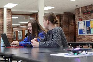 Computer Science Foundations students learned how to program drones to accomplish specific tasks with block coding software. They instructed their drones to take off, move through the air and land on circular paper targets on a cafeteria table. The drones had to land on all three targets that were arranged in a triangular shape in the lunchroom.