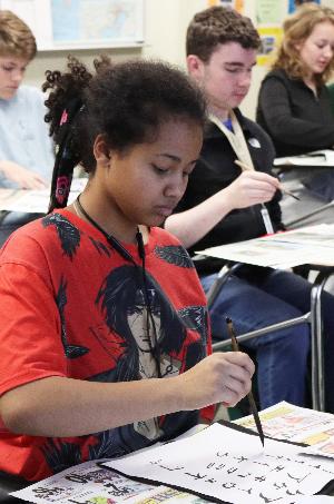 The class then moved on to a calligraphy assignment, which provided additional training with the written word. They brushed Japanese characters on special paper in a practice referred to as shodo. Calligraphy is an important part of the country’s culture and is a key part of the school curriculum there.