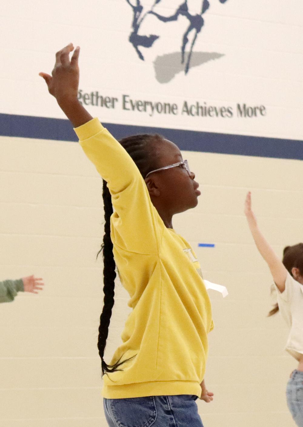A McPhee Elementary School student performs ballet choreography during a Backstage at the Ballet event in December. Southeast High School student Teagan, Southwest High School student Ada and East High School student Taryn helped the Mustangs learn movements throughout the morning session. Members of the Lincoln Midwest Ballet Company taught students about dancing, costuming and makeup throughout the week.